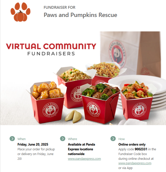 Join our nationwide Panda Express Fundraiser on June 20th! No matter where you are in the US, you can make an online order with our special fundraiser code to help support our rescue! We earn 28% of all the sales made using that code on June 20th. Use the code 9002331, when you order online to support our kitties!